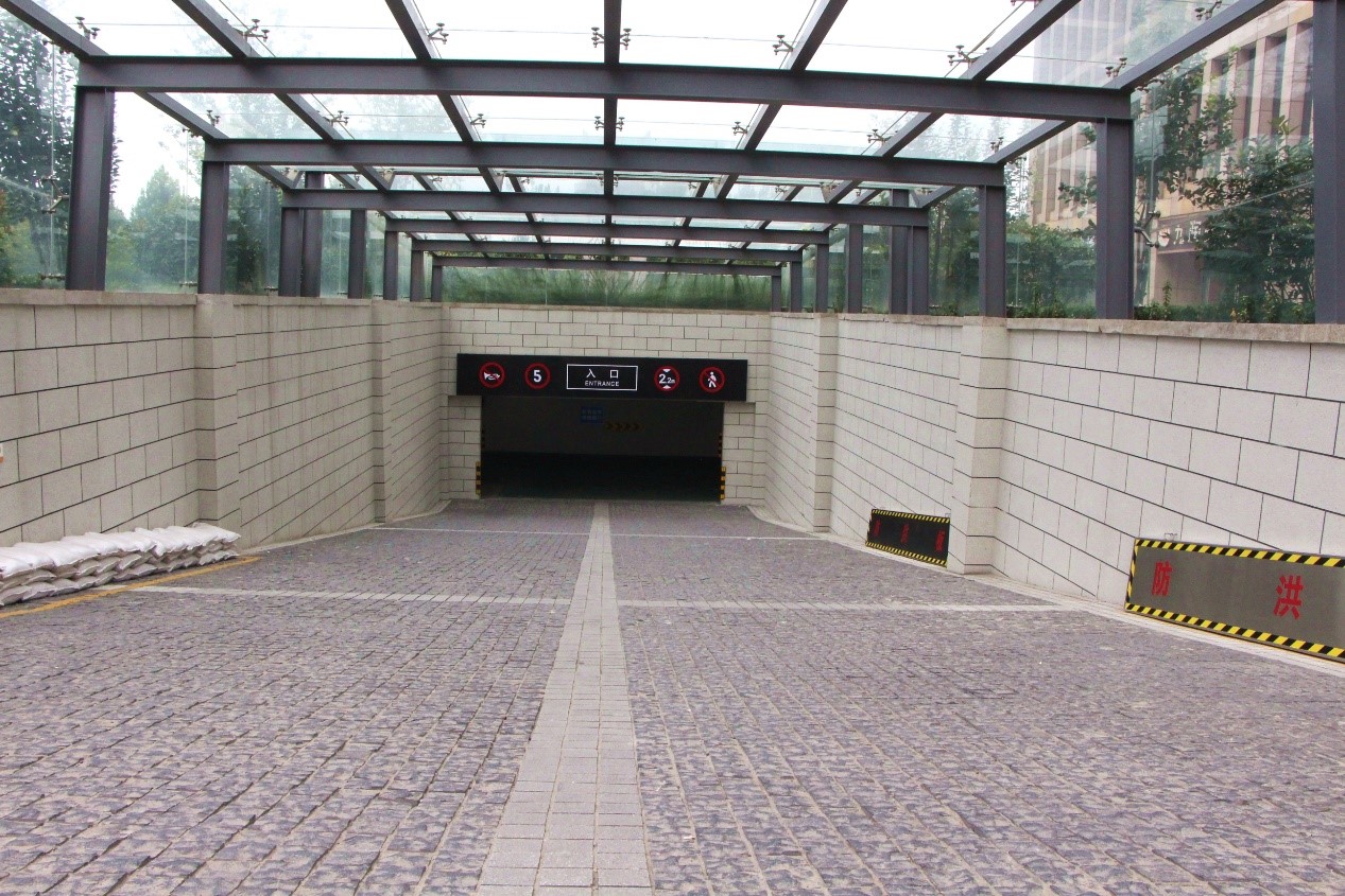 車庫出入口地面干凈整潔,存放防洪板、防洪沙袋應(yīng)對雨季