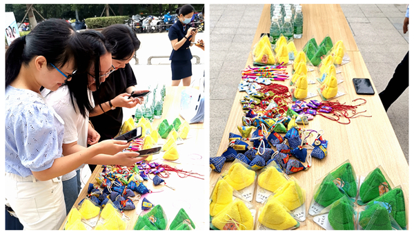 看著小姐姐認(rèn)真的樣子,小哥哥快樂的笑容;用彩色筆在潔白的空殼雞蛋上畫出各式各樣的圖案,一個個漂亮的彩蛋就完成了。五色線、涂彩蛋、制香囊.....平時忙碌的生活與工作,在此刻都放松下來,享受著美好而又愉快的節(jié)日氛圍;怎么說也得拍張照片,紀(jì)念一下美好時刻。除了現(xiàn)場包粽子,我們還把端午的粽子送到了一位位商戶手中,帶著這份心意與祝福,共同度過這個美好的節(jié)日。